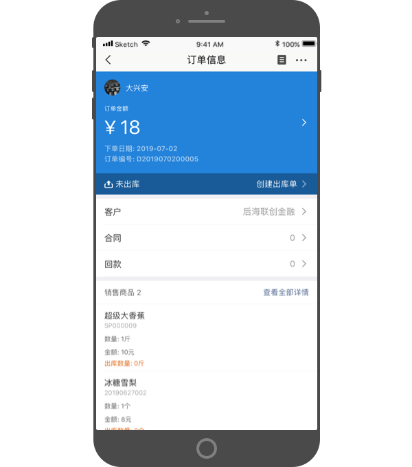 进销存版中,订单审批通过后,在销售订单详情界面,可以快捷创建出库单,将销售订单里的商品出库。