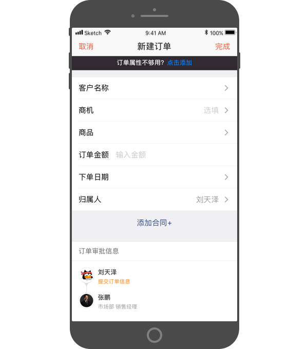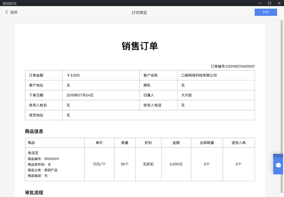 - 创建完订单内容,审批人审批通过后即可生效;有“无需审批”权限的员工,订单信息直接生效。