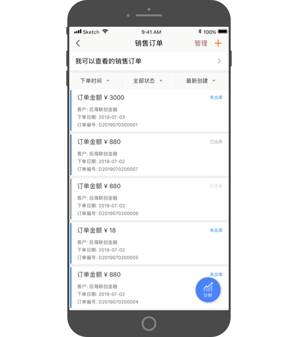进入"销售订单",点击界面右下角的蓝色图标,查看订单分析。