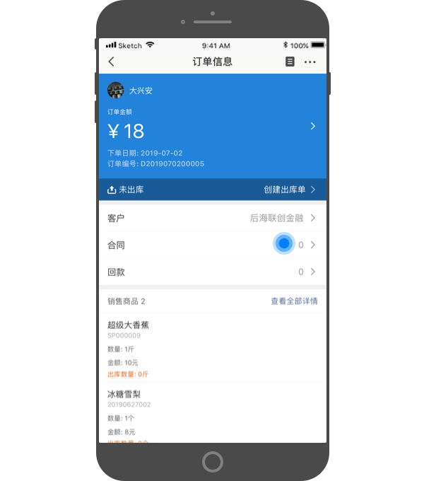 进入"销售订单",点击右上角的 "+",创建订单。在进销存版中,创建销售订单后,可以快捷创建出库单,将订单中的商品快速出库。