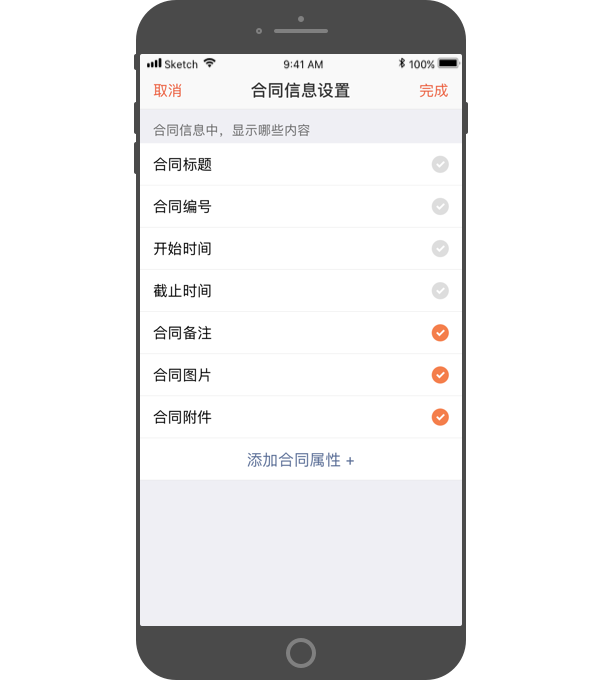 - 合同信息设置:设置合同信息中显示哪些内容,如合同备注、合同图片等,支持自定义添加合同属性。