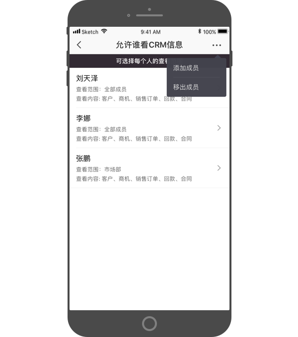 - 可分别设置每个人的CRM信息查看范围,如客户、商机、销售订单、回款、合同。