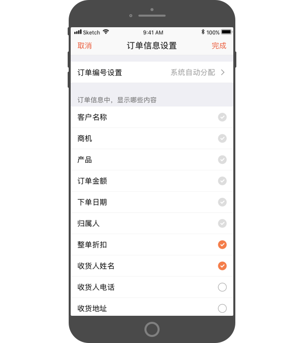 - 设置订单列表中是否显示更多信息,如订单折扣、收货地址、交货日期等;还可自定义添加订单属性;订单编号设置:默认为系统自动分配,也可设置为“手动输入”。