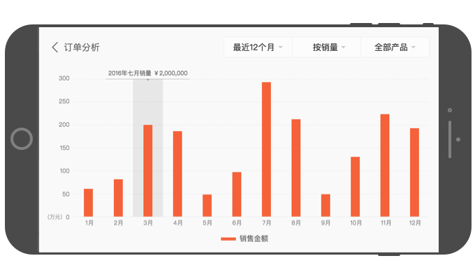 可查看最近12个月及过去某一整年(如2014年1月-12月)的订单成交量、订单金额的变化趋势。