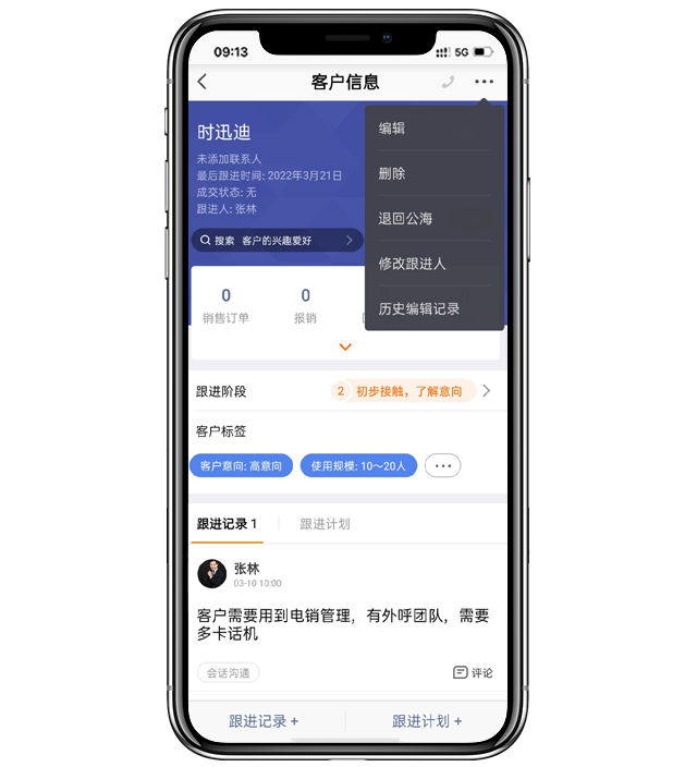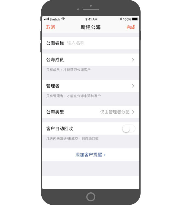 - 添加客户提醒:可对公海设置定期提醒,若公海客户被分配/领取后 X天 未跟进/未成交 则提醒。