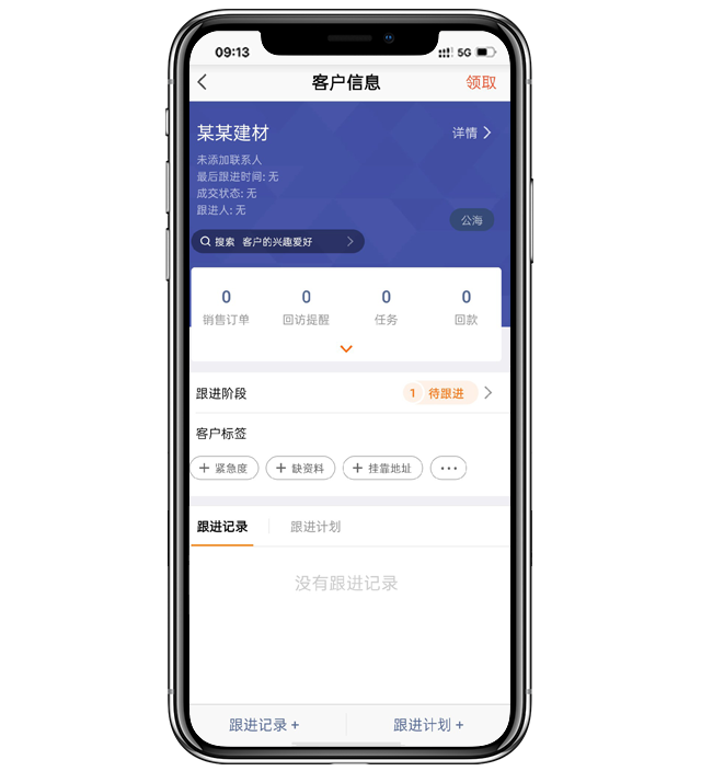 - 领取客户公海成员,进入一个公海客户信息界面,点击右上角“领取”,即可领取该客户。