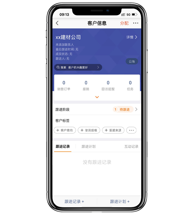 - 分配客户公海管理者,进入一个公海客户信息界面,点击右上角“分配”,即可将该客户分配给销售人员。