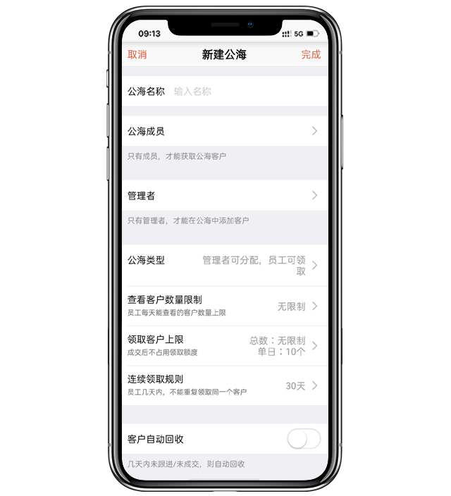 - 选择公海类型,“仅由管理者分配” 或“管理者可分配,员工可领取”