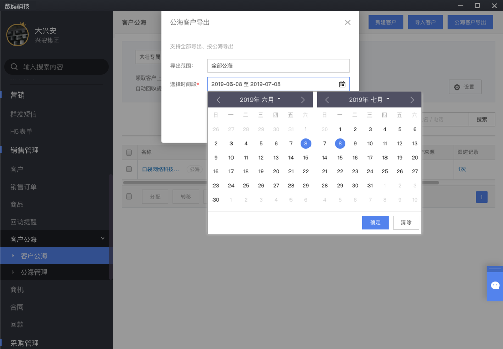 在电脑端,进入"客户公海",点击右上角"导出",可在权限范围内,导出公海。选择导出范围,导出为一份表格。