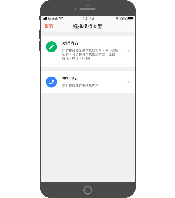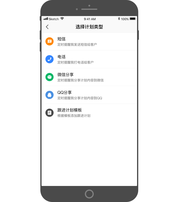 - 选择“发送内容”,将定时提醒员工发送信息给客户,如短信、微信、QQ,员工使用该类型模板时,可自行选择发送方式。