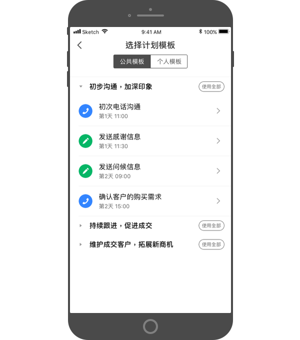 如果想要使用模板组内的全部模板,则点击模板组右侧的“使用全部”,就可直接使用全部模板,批量创建跟进计划。