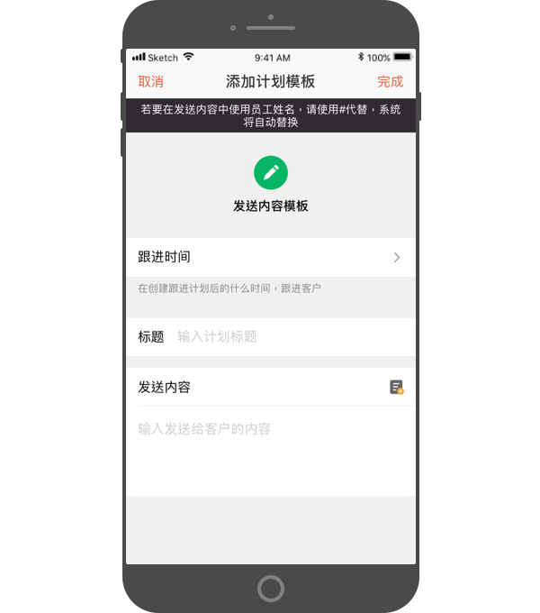 - 发送内容:输入发送给客户的内容(ps:若要在发送内容中使用员工姓名,请使用#代替,系统将自动替换)