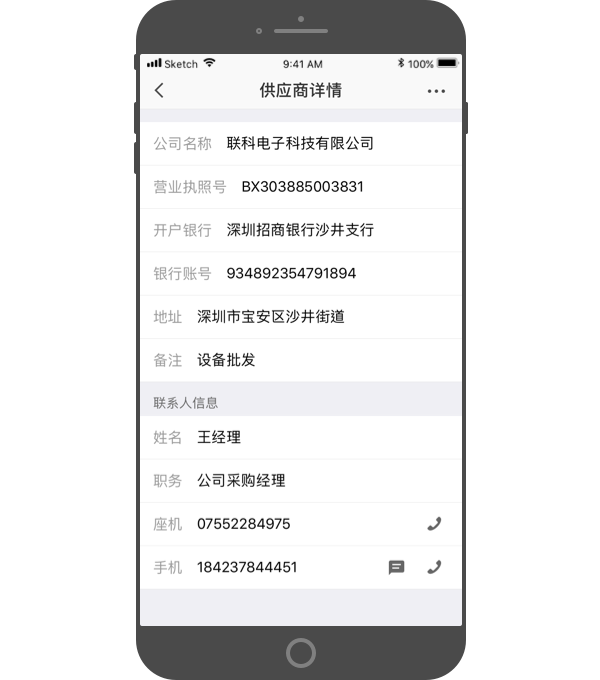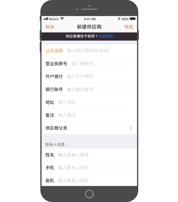 - 填写供应商的联系人姓名、手机号等信息。