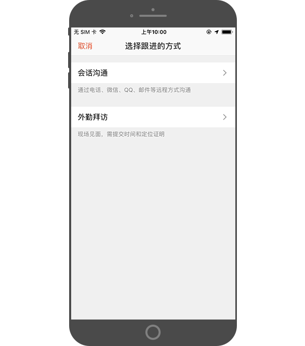 创建跟进记录时,跟进方式可以分为 会话沟通、外勤拜访 两种。