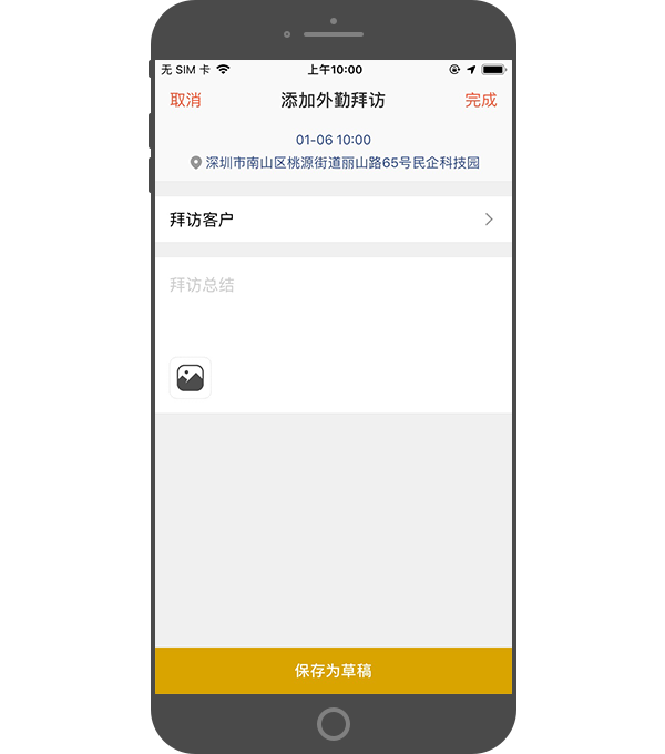 - 保存为草稿:若在客户现场时间紧张,可先保存一份拜访草稿(时间和位置都以拜访现场为准),待时间充裕后,再完善内容提交。