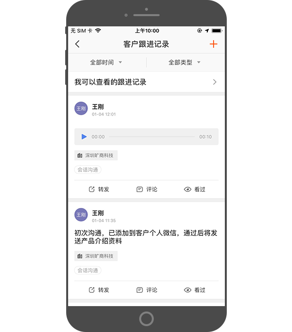 - 在拜访记录下方,支持“评论”“谁看过”“转发”模块,数字化显示,工作更直接。