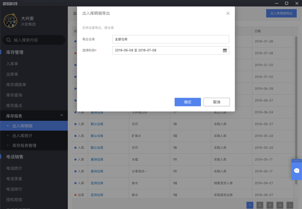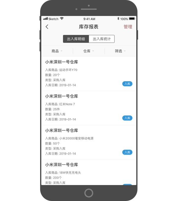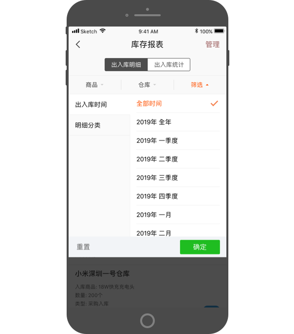 - 可以按出入库时间、明细分类,筛选查看。