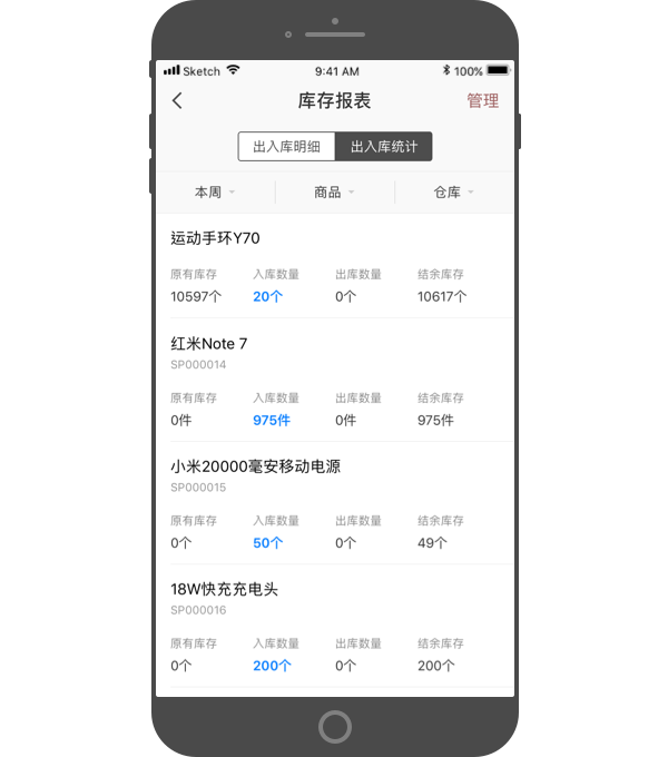 - 可以按某天、某周、某月、某季度,查看对应的出入库统计数据。