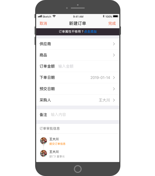 - 填写订单金额,选择下单日期、预交日期、采购人等。还可以添加更多的订单属性,完善订单信息。