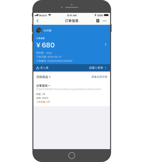 完成订单后,通过审核,可以直接创建"入库单",将该采购订单中的商品入库。