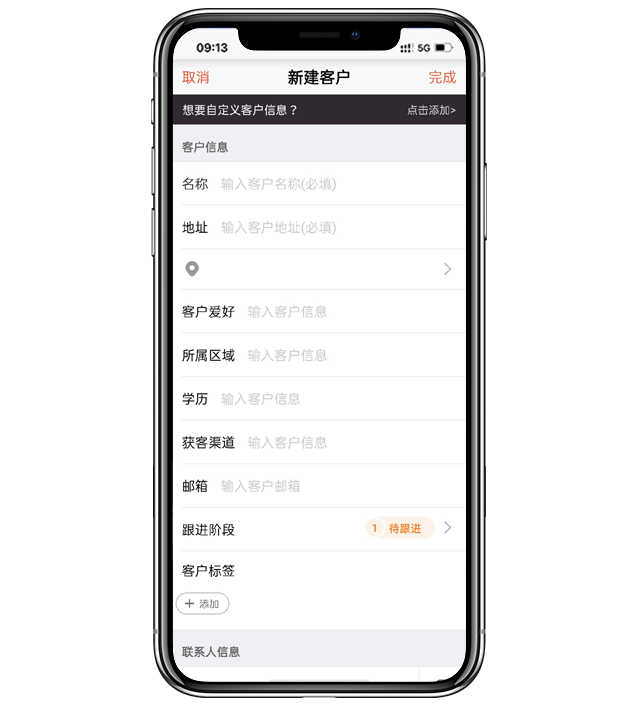 - 手工填写客户信息,还可以设置客户类型,方便大家更好的管理客户。PS:除了必填项,其他的信息可以不填,且一个客户可以添加多个联系人。