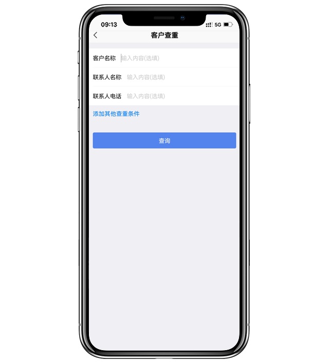 - 输入客户名称,联系人名称、联系人电话,即可查重重复客户。还可添加其他查重条件,如客户地址、客户编号等,查重更准确。