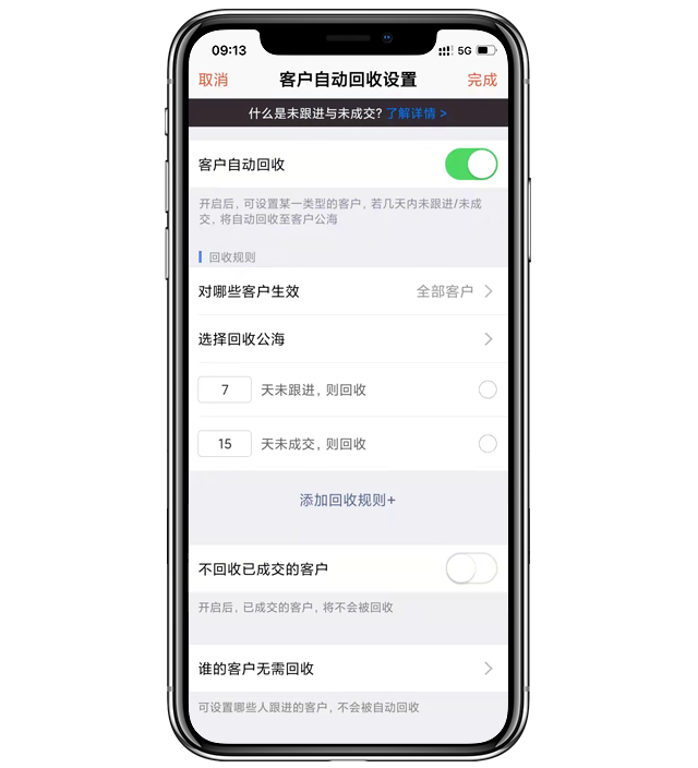- 设置客户自动回收,可选择满足特定条件的客户,若客户几天内未跟进/未成交,将自动回收至客户公海。