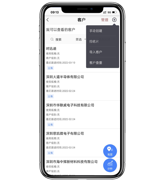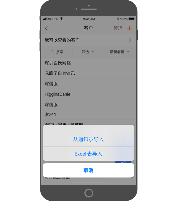 进入“客户”,点击右上角的“+”,可采用多种方式创建客户:手动创建、拍名片创建、Excel表导入或通过通讯录导入。