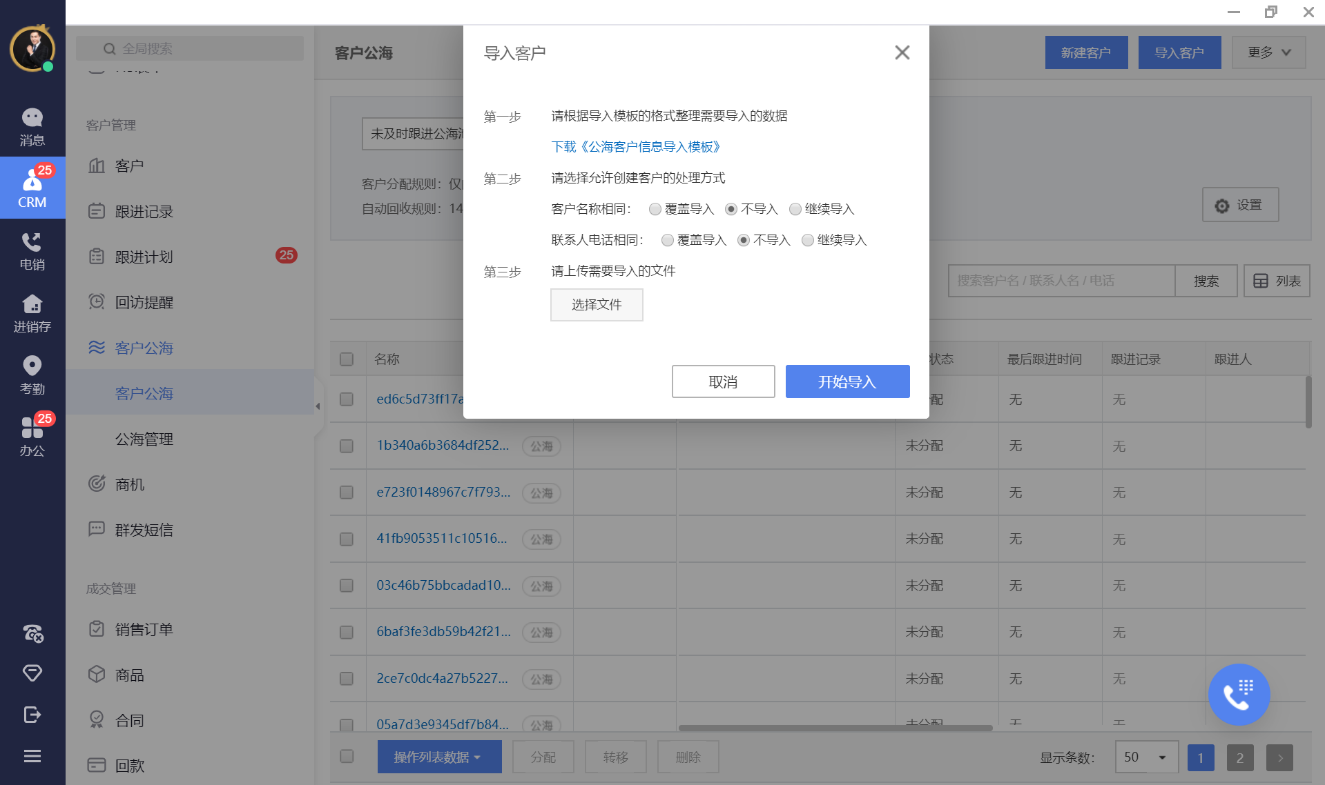 - 下载模板,并根据模板填写客户信息,然后选择客户重名时的覆盖方式。客户数据中没有跟进人时,可以选择跟进人为自己或选择成员为跟进人。完成后,点击开始导入即可。