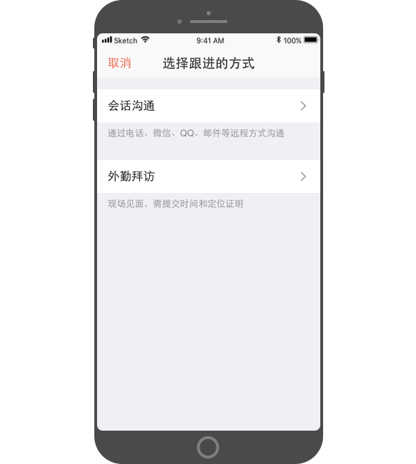 - 会话沟通:与客户通过电话、微信、QQ、邮件等远程方式沟通的记录。