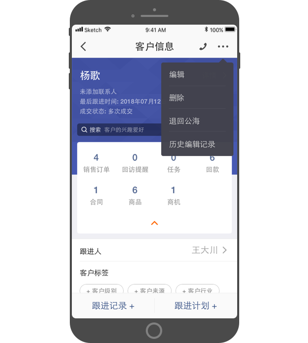 1. 拨号:可一键拨号,联系该客户。