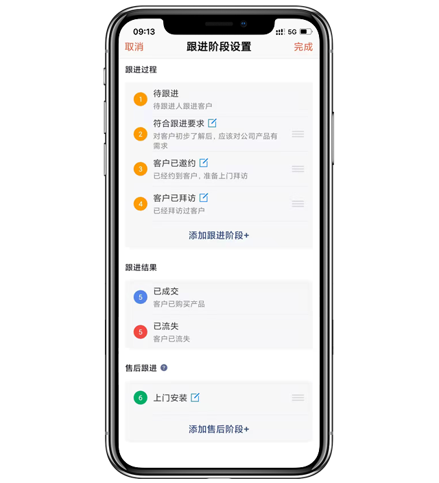 - 设置是否开启跟进阶段显示。跟进阶段拆分为跟进过程、跟进结果、售后跟进,可根据需求添加跟进阶段。