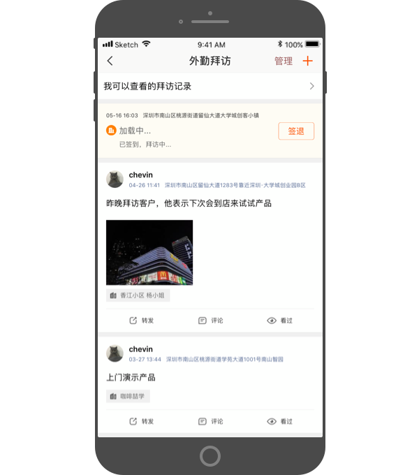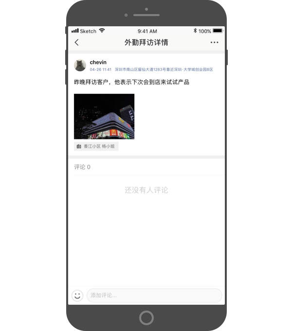 在拜访记录下方,新增了“评论”“谁看过”“转发”模块,数字化显示,工作更直接。