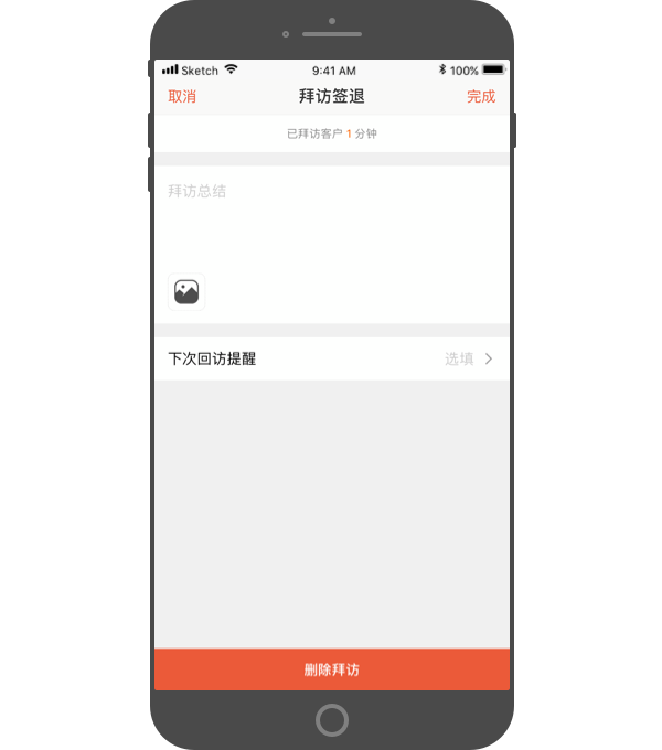 - 可输入拜访后的总结和心得。如要求严格,还可以拍照证明