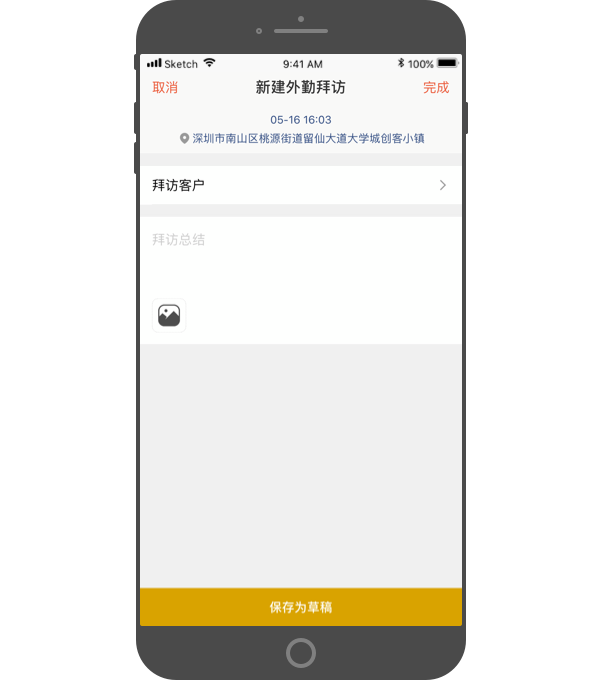 - 若在客户现场时间紧张,可先保存一份拜访草稿(时间和位置都以拜访现场为准),待时间充裕后,再完善内容提交。