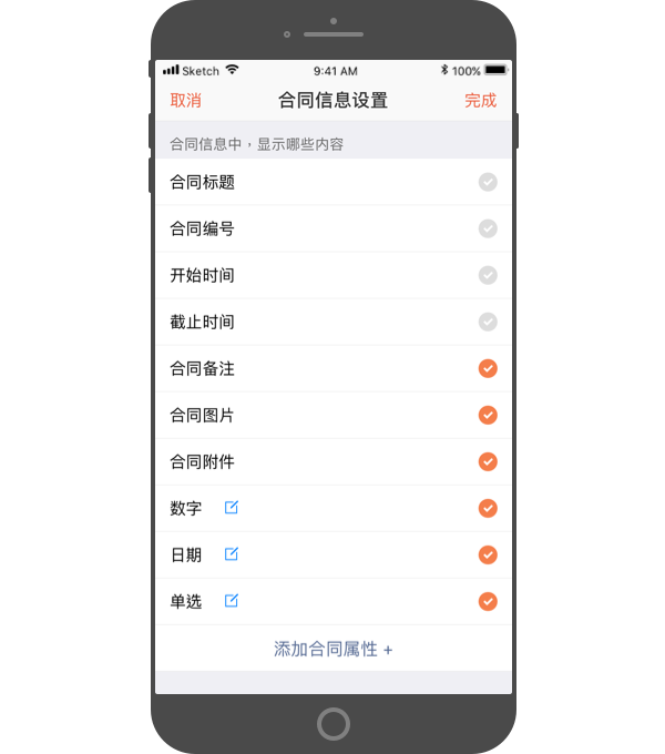 根据企业实际需求,设置合同信息中,显示哪些内容,如合同备注、合同图片等;管理员还可自定义添加合同的表单属性。