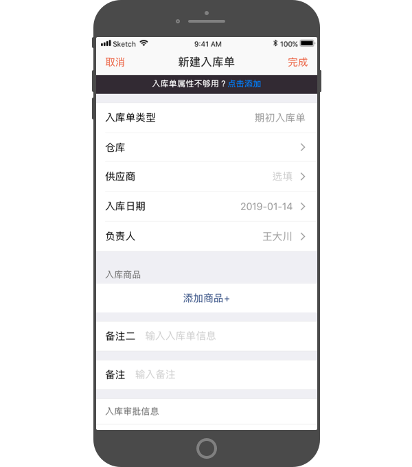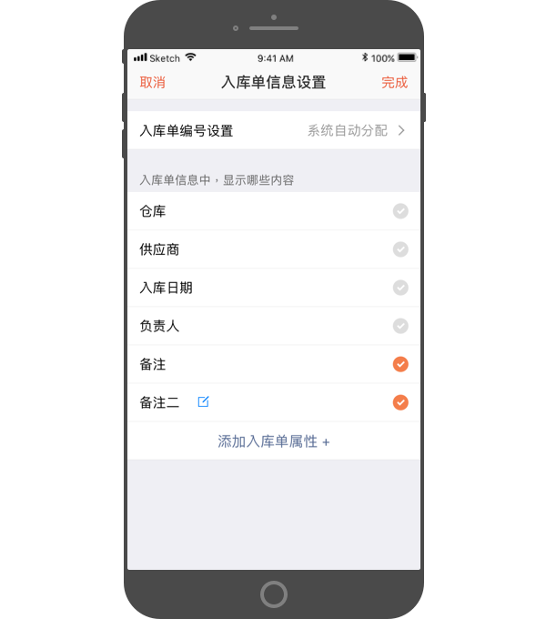 - 可设置入库单的信息,包括:入库单编号、仓库、供应商、入库日期、负责人等,还可自定义添加入库单属性。PS:入库单编号,默认为系统自动分配,也可设置为“手动输入”