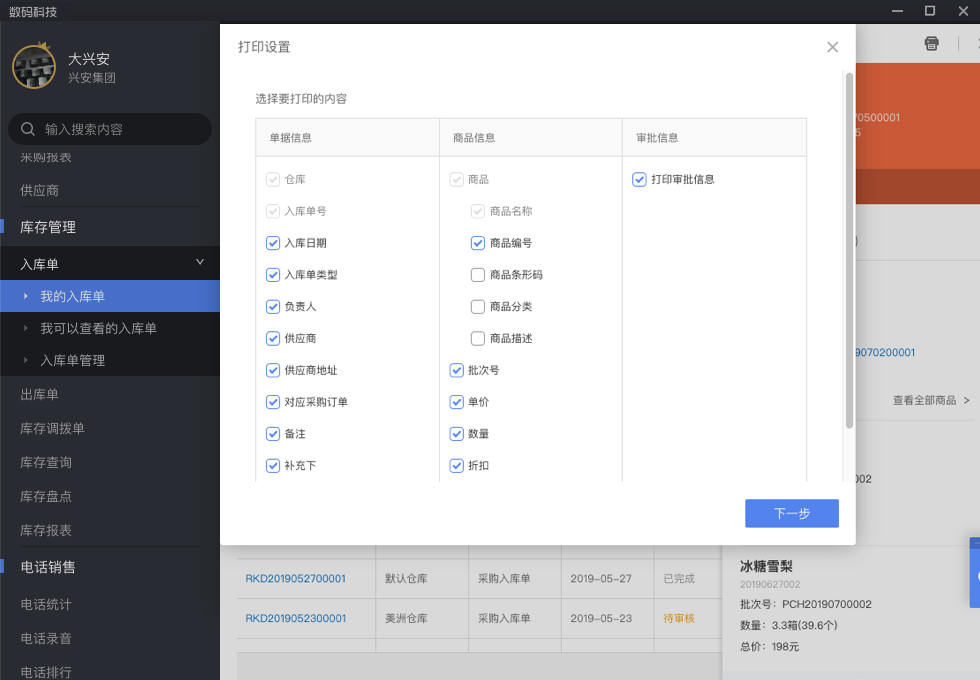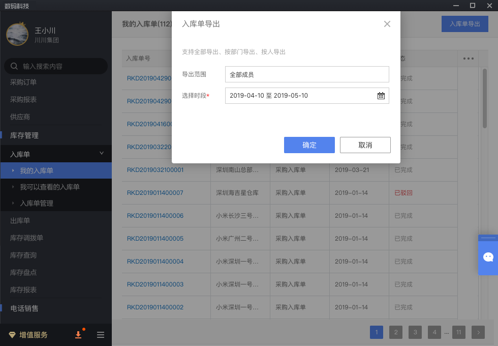 在电脑端,进入"入库单",可在权限范围内,导出和打印。
