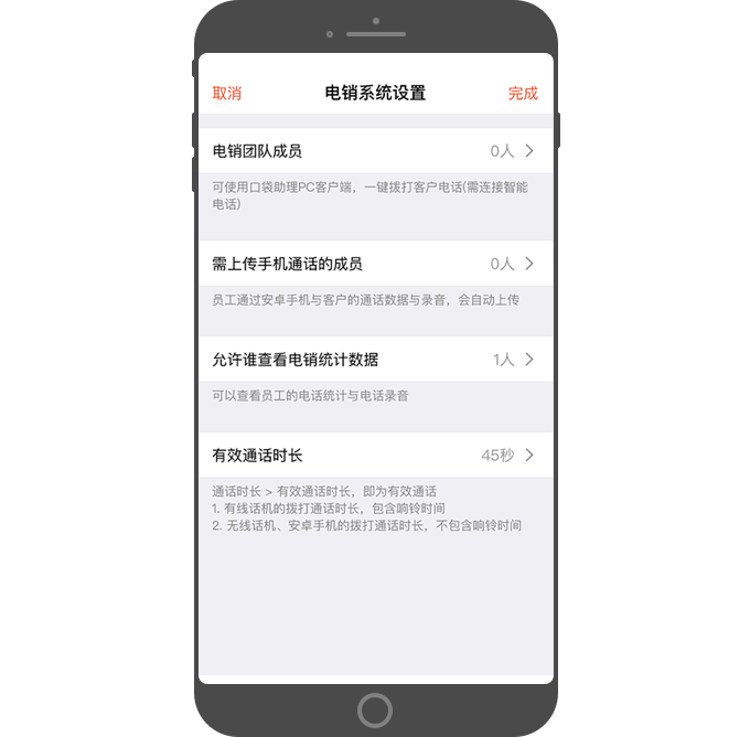 - 设置每个成员拨打电话的通话时长。当 实际通话时长(包括响铃时间)大于既定值(如45秒),即为有效通话。