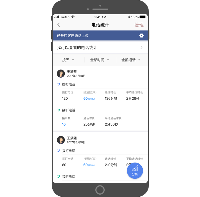 - 可按天、周、月,筛选查看电话统计数据。