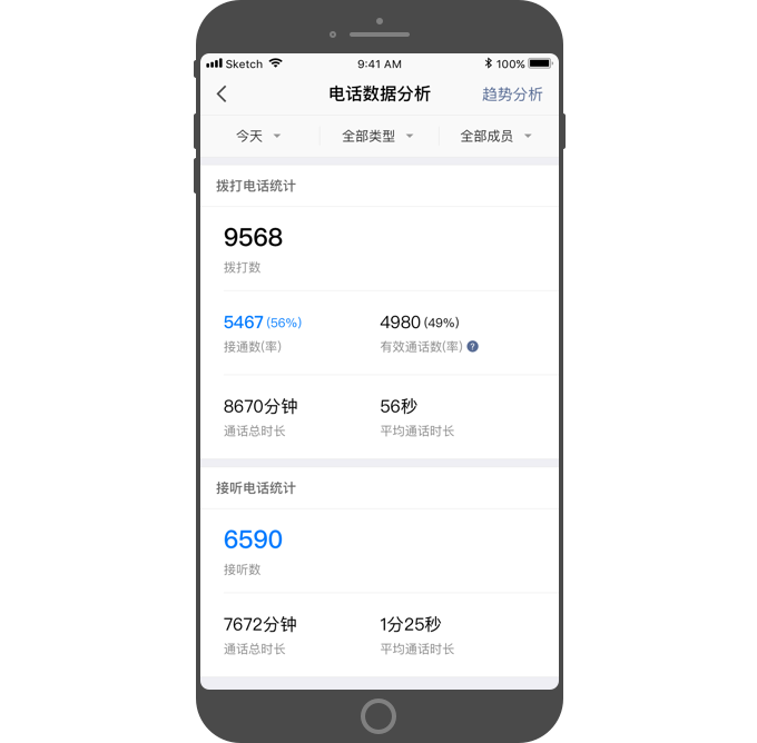 - 可按全部通话、有效通话、自定义,筛选查看电话统计数据。