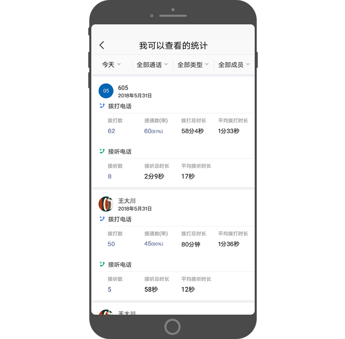 - 可按全部成员、单个成员, 筛选查看电话统计数据。
