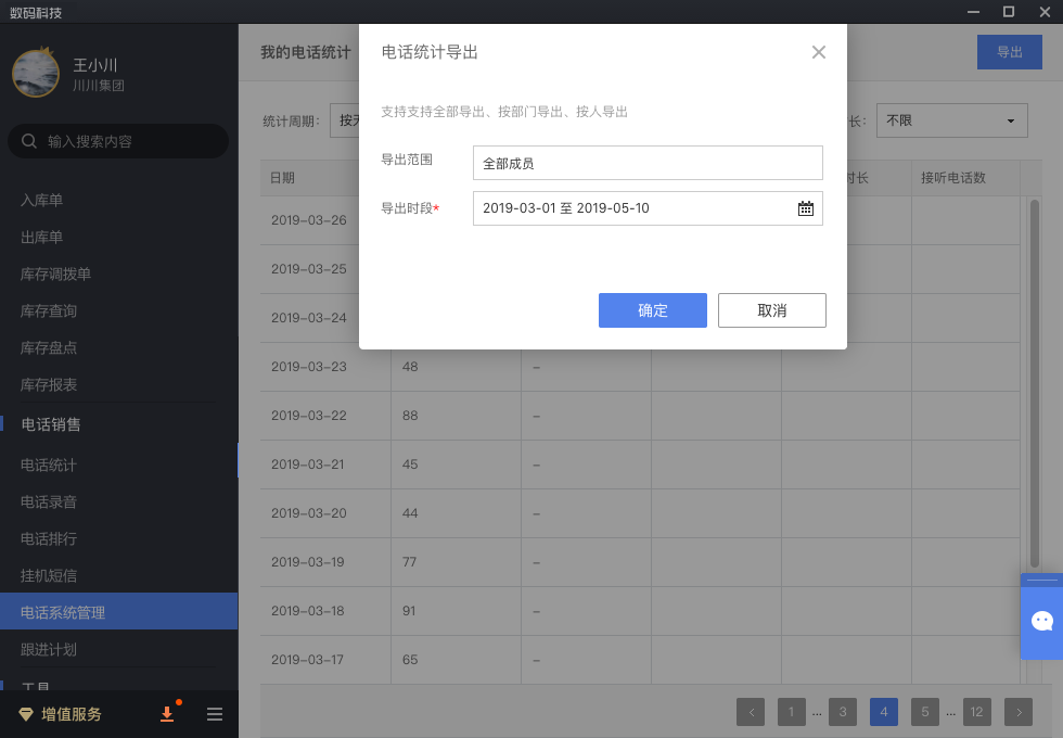 在电脑端,点击右上角"导出",可在权限范围内,导出电话统计。选择导出范围,导出为一份表格。