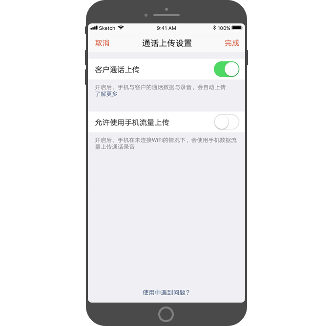 - 点击后,可开启/关闭“客户通话上传”。点击“使用中遇到问题”,以查看更多解决方案,还可以检测机型适配,以确认机型是否支持“客户通话上传”功能。图:通话上传设置