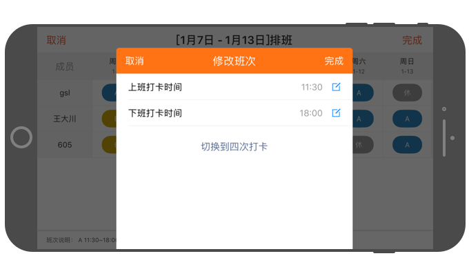 - 切换打卡模式系统默认为一天两次打卡。如果企业同时有四次打卡的需求,管理员还可以选择切换到一天四次上下班打卡。