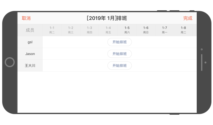 选择后,一次为员工排一个月的班次。进入排班界面,点击“开始排班”。