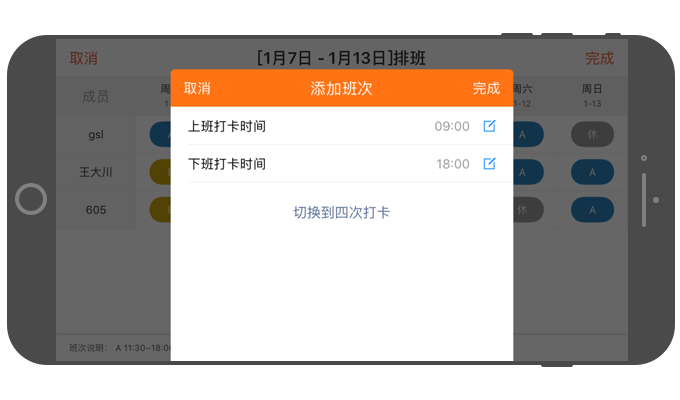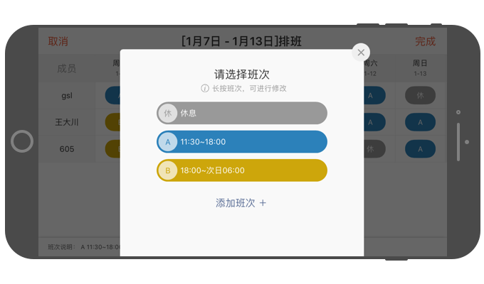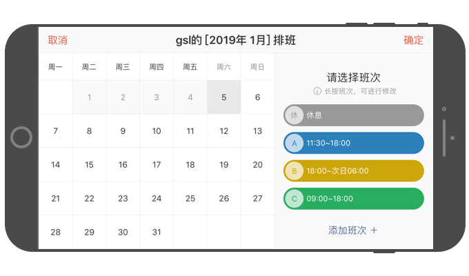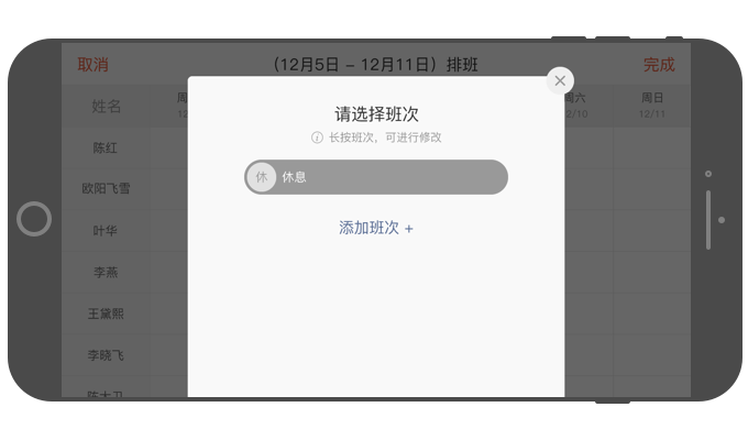 系统默认拥有“休息”班次,可直接点击添加新的班次;同样也可以长按班次,进行修改。