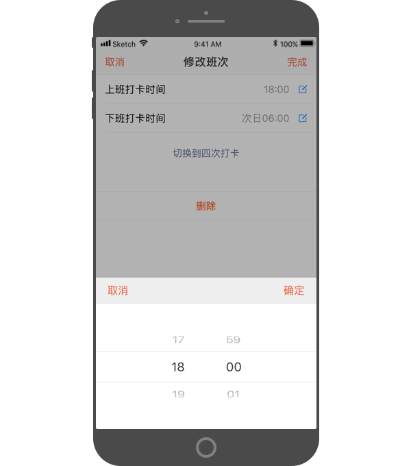 - 上、下班打卡时间设置:可设置上、班打卡时间,上班时间须早于下班时间。