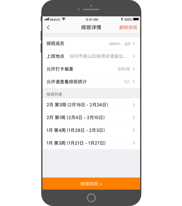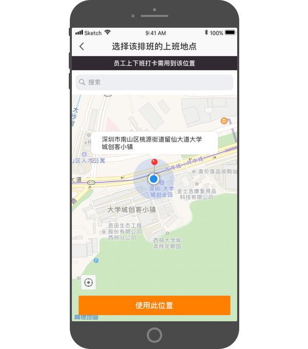 默认定位在当前位置,也可以使用搜索功能找到排班地点