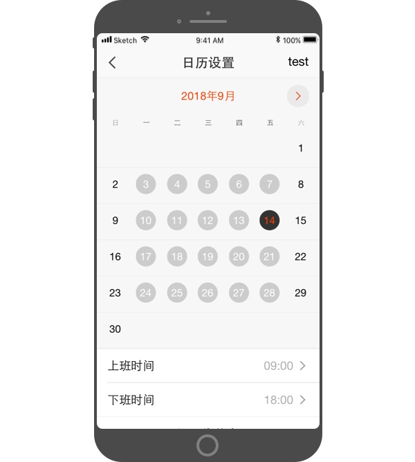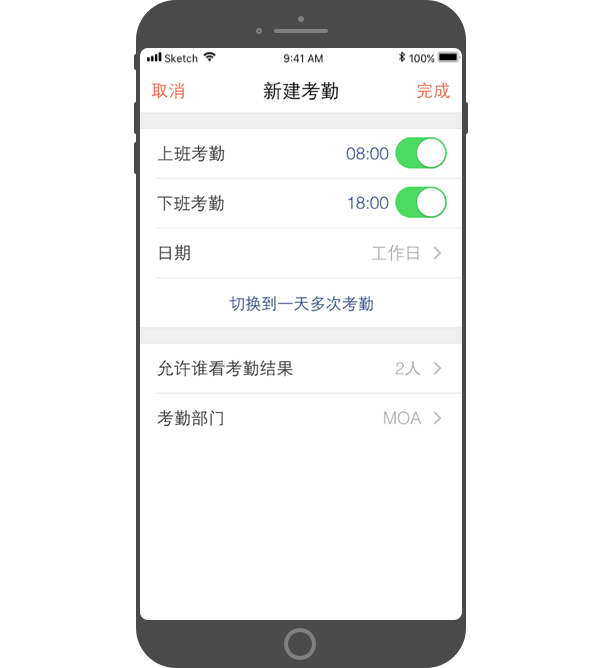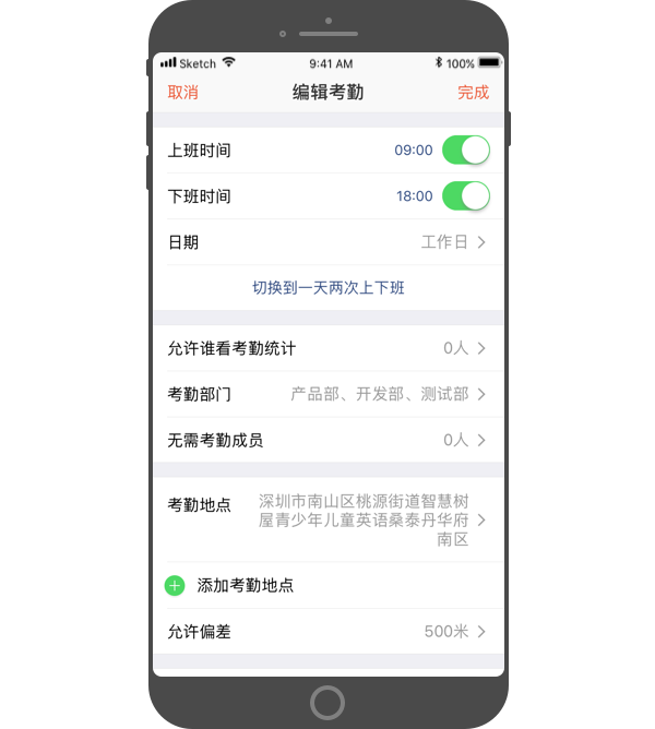 - 开启 "上下班考勤" 并设置上班和下班时间
